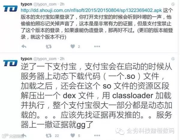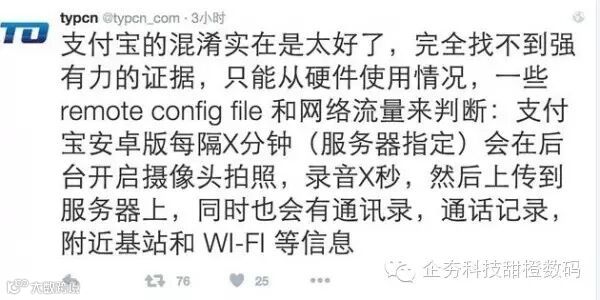 昨日,知乎上有网友曝光“支付宝Android版隐私门”事件,曾经曝光“12306 泄密事件”、上过CCTV的用户typcn在Twitter中发文,称“支付宝安卓版每隔X分钟(服务器指定)会在后台开启摄像头拍照,录音X秒,然后上传到服务器上,同时也会有通讯录,通话记录,附近基站和WiFi等信息。”