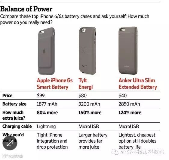 市面上还有容量更大、更便宜的充电保护套。比如Anker的超薄扩展电池保护套,售价只要40美元。它可以将没有电的iPhone 6S充满还余下24%的电量。80美元的Tylt Energi保护套可以充一次半。