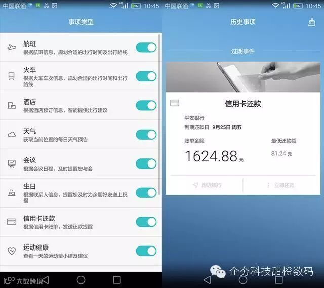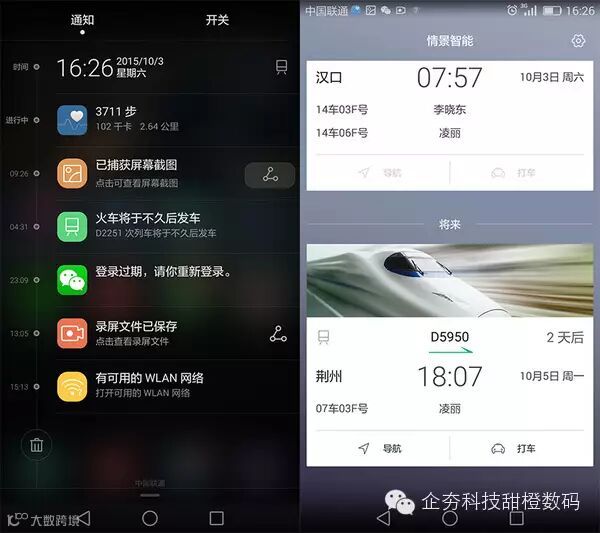 下拉华为Mate S的通知栏,左边的时间轴,就属于情景智能的一部分了。华情景智能可以通过收集并读取信息对用户的行为进行“猜测”,同时可以自动生成事项卡片,来提醒用户完成待办事项。华为Mate S支持的事项非常多,包括航班、火车、天气、生日、信用卡还款等等,通过通知中心的方式,主动告诉用户,开启了一种全新使用体验。