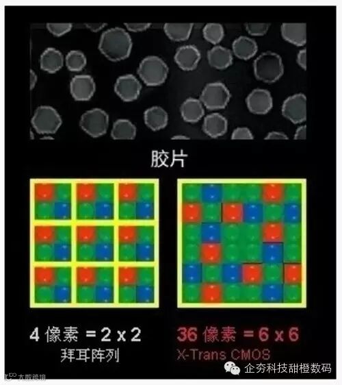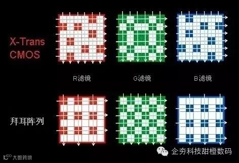 另一种就是富士开发的 X - Trans 传感器,它与基于传统的拜耳阵列传感器上革新的传感器,传统拜耳传感器为 2 × 2 的 RGBG 排列,而 X - Trans 传感器则是以 6 × 6 的像素排列。其中 X - Trans传感器的 RGB 像素滤片排列顺序是从胶片的银盐颗粒无序性上得到的启发,对传感器的色彩滤镜阵列进行修改,添加了模拟的无序性排列。说是无序性,其实还是不能看出一定的规则顺序的,只不过 6 × 6 这种大间隔有规则方向排列的重复频率相比起拜耳阵列确实要小得多,所以这种阵列方式也能够在很大程度上减轻了摩尔纹的产生。而 X - Trans 传感器当中绿色的滤片会比较多些,官方说法是人眼对绿色最敏感,所以增加多点绿色,让色彩更真实一些(就是更艳丽,更贴合人眼观感)。