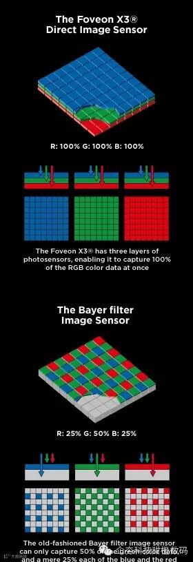 适马的 X3 传感器与传统拜耳阵列传感器结构完全不同,传统的拜耳阵列传感器为一层的 RGBG 滤片设计,而适马的 X3 则是与胶卷的三层结构设计类似,在传感器上方铺满 BGR 三层像素叠加而成,就像是胶卷上面的三层乳剂一样,只不过胶卷是没有像素点这种东西的。X3 感光元件的每一个像素都能够感应到 RGB 三种色彩,从而在同一个像素上就完成了色彩的匹配数据,而且不再需要像拜耳阵列一样使用了 “猜色”(反马赛克运算) 技术才能填上临近像素的色彩。由于直接省略了 “猜色” 的过程,所以适马 X3 对于像素色彩之间干扰就等于没有了,而且对于色彩的还原准确性来说会更好一些。然而也因为使用了三块像素滤片叠加的原因,对于光线的衰减也是一个问题,特别是在最底层的红色像素滤片会比较吃亏,不过从众网友拍摄直出的色彩来说好像问题也并不大,而且很多人在拍摄之后会选择后期处理,色彩的调校就看你自己的喜好了。