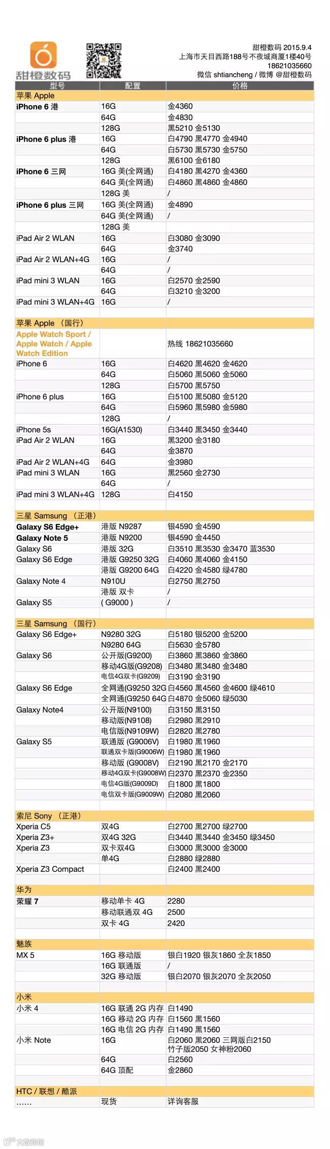 iPhone 6 及 plus 港版走势稳定,今天轮到 128G 大容量版本迎来降价,国行版价格稳定,美版 plus 64G 缺货;三星 Galaxy 各款稳定;索尼新款 Xperia Z5 发布,旧款 Z3+、Z3、Z3 Compact 开始稳步走低。