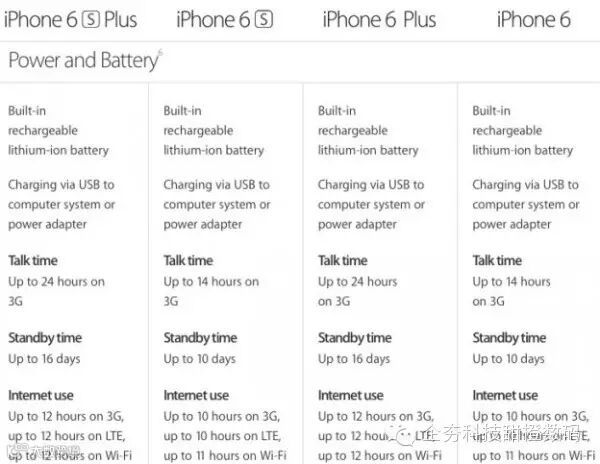 从图中我们可以看到,iPhone 6s 和 iPhone 6 无论是在 3G、Wi-Fi 还是 LTE 网络下的续航都是一样的,3G 通话都为 14 小时,iPhone 6s Plus 和 iPhone 6 Plus 的续航也是一样。