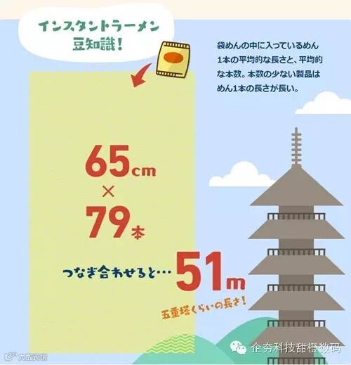 平均每袋袋装方便面中有79根面条,而一根面条的平均长度是65cm。这两个数值相乘,可以得出,每袋袋装方便面中面条的总长度约是51m,大约是日本五重塔的高度。