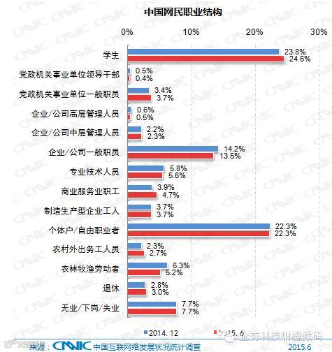 截至2015年6月,网民中学生群体的占比最高,为24.6%,其次为个体户/自由职业者,比例为22.3%,企业/公司的管理人员和一般职员占比合计达到16.3% 。
