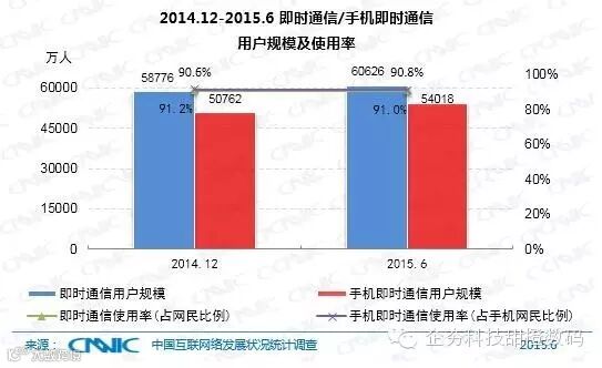 截至2015年6月,网民中即时通信用户的规模达到6.06亿,较去年底增长了1850万人,占网民总体的90.8%,其中手机即时通信用户5.40亿,较去年底增长了3256万人,占手机网民的91%。