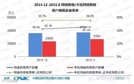 截至2015年6月,我国网络购物用户规模达到3.74亿,较2014年底增加1249万人,半年度增长率为3.5%;2014年上、下半年,这一增长率分别为9.8%和9.0%,数字表明我国网络购物用户规模增速继续放缓。与整体市场不同,我国手机网络购物用户规模增长迅速,达到2.70亿,半年度增长率为14.5%,手机购物市场用户规模增速是整体网络购物市场的4.1倍,手机网络购物的使用比例由42.4%提升至45.6%。