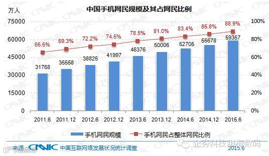 截至2015年6月,我国手机网民规模达5.94亿,较2014年12月增加3679万人。网民中使用手机上网的人群占比由2014年12月的85.8%提升至88.9%。