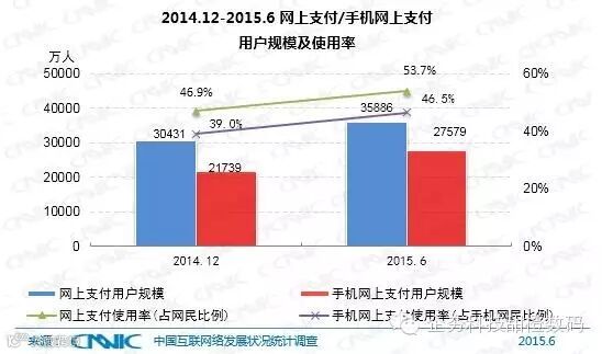 截至2015年6月,我国使用网上支付的用户规模达到3.59亿,较2014年底增加5455万人,半年度增长率17.9%。与2014年12月相比,我国网民使用网上支付的比例从46.9%提升至53.7%。与此同时,手机支付增长迅速,用户规模达到2.76亿,半年度增长率为26.9%,是整体网上支付市场用户规模增长速度的1.5倍,网民手机支付的使用比例由39%提升至46.5%。