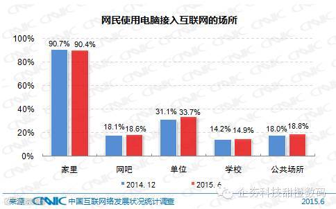 截至2015年6月,我国网民在家里、网吧、学校和公共场所通过电脑接入互联网的比例与2014年12月基本持平,而在工作单位通过电脑接入互联网的比例则有所上升,为33.7%。