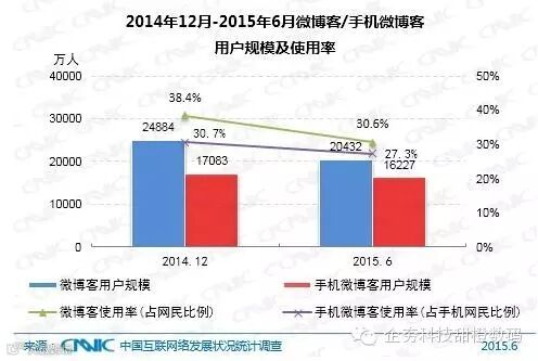 截至2015年6月,我国微博客用户规模为2.04亿,网民使用率为30.6%,手机端微博客用户数为1.62亿,使用率为27.3%。自2013年开始,搜狐、网易、腾讯等公司对微博客投入力度陆续减少,微博客市场内部的品牌竞争格局已经明朗,用户逐渐向新浪微博迁移和集中。