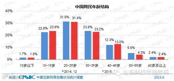 截至2015年6月,我国网民以10-39岁年龄段为主要群体,比例达到78.4%。其中,20-29岁年龄段网民的比例为31.4%,在整体网民中的占比最大。与2014年底相比,20岁以下网民规模占比增长1.1个百分点,互联网继续向低龄群体渗透。