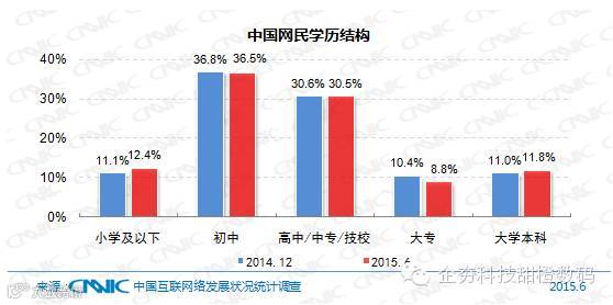 截至2015年6月,整体网民中小学及以下学历人群的占比为12.4%,较2014年底上升1.3个百分点。与此同时,大专及以上人群占比下降0.8个百分点,中国网民继续向低学历人群扩散。