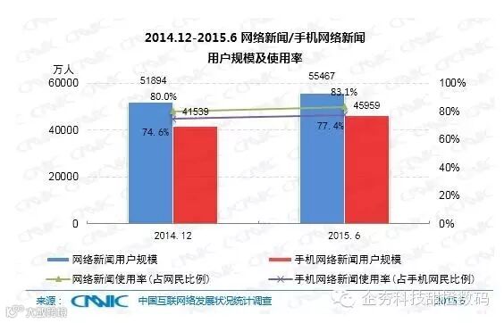 截至2015年6月,我国网络新闻用户规模为5.55亿,较2014年底增加3572万,增长率为6.9%。网民中的使用率为83.1%,比2014年底增长了3.1个百分点。其中,手机网络新闻用户规模为4.60亿,与2014年底相比增长了4420万人,增长率为10.6%,网民使用率为77.4%,相比2014年底增长2.8个百分点。