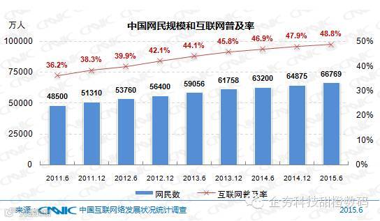 截至2015年6月,我国网民规模达6.68亿,半年共计新增网民1894万人。互联网普及率为48.8%,较2014年底提升了0.9个百分点,整体网民规模增速继续放缓。