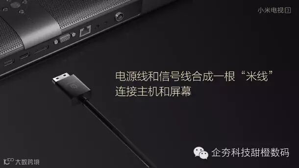 小米电视最大的特点为分体电视,屏幕和主机可以分开独立升级。接口不在电视上,而在独立音响上。电视的主体放在了音响上将主板面积缩小了一半。电源线和信号线合成一根,称为“米线”。