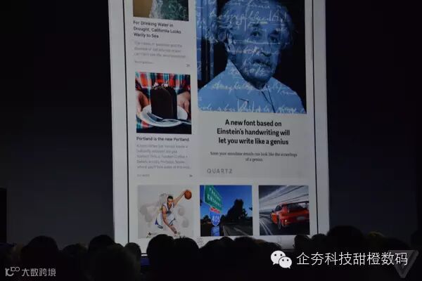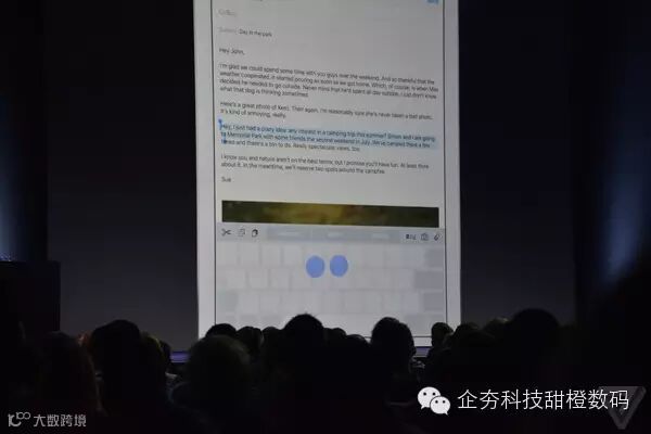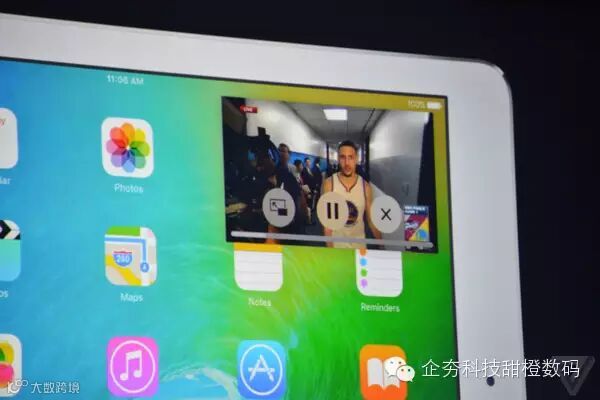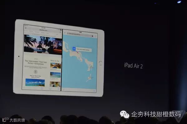 SplitView:iPad从此开始支持分屏多任务,现场演示了将备忘录贴边,在照片以及Safari中汲取素材,窗口支持3:7以及5:5,操作方式与Windows 8/8.1中较为类似;此外,现场也演示了通过悬浮窗口观看ESPN视频(三星有的嘲讽了...XP...)。这项功能支持iPad Air/Air2/mini2/mini3,老用户洗洗睡吧。