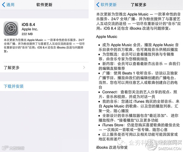 iOS 9正式版要在秋季才能与苹果用户相见,不过在此之前也有一些惊喜。昨晚Apple(苹果)正式推送了iOS 8.4系统升级,应该是iOS 8的最后一个大版本了。其中率先带来了Apple Music音乐流媒体服务,集成的Beats 1广播也正式24/7全天候开播,此外更新还有对iBooks以及bug等项目的修复。