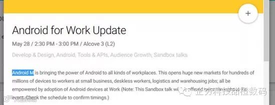 Android的下一个版本,即盛传已久的Android M很可能会在Google I/O大会上被正式发布。一个在业内已经被热议的议题是:Android M“为工作升级而生”(Android for Work Update)。有业内人士解释道:“Android M将把Android的强大功能拓展至任何你所能看到的工作领域。”