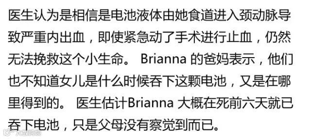 这样的事例已不是首次,2013年,澳大利亚的4岁女孩Summer Steer 就因吞食一枚纽扣锂电池,造成胃出血不救身亡。医生说,纽扣锂电池通常会卡在食道或喉咙,两小时内就会因外壳破裂泄漏出腐蚀酸性物质,灼伤食道。吞入胃里一旦被胃酸腐蚀,会导致胃出血。