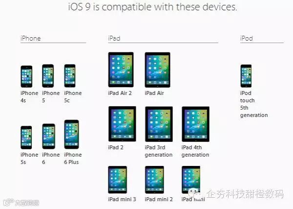 按照以往苹果的升级策略,每一个新 iOS 版本的升级,总会有那么一两款较旧的 iOS 设备无法获得升级。到 iOS 9,预期应该不会支持 iPad 2 和 iPhone 4S 了。但是,iOS 9 对设备支持的情况大幅改善,依旧维持了与 iOS 8 相同的设备兼容性,侧面也说明 iOS 9 进行了优化并增强了系统的性能。