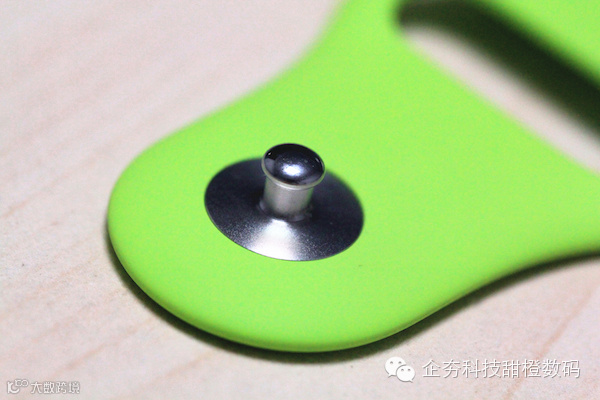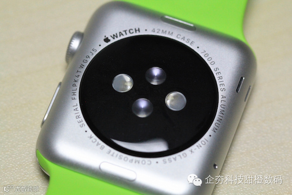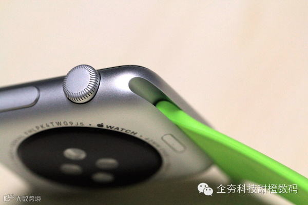 翻到手表的背面会看到一个稍微突起的圆形,里面的感应器清晰可见,这是测心率用的。这背面突起部分用的材质很舒适,根据苹果官网的介绍,表背覆盖的是陶瓷,而保护感应器用的是蓝宝石水晶镜片。尽管这部分是突起的,但在佩戴过程中丝毫不会感觉硌手。整块手表处处都是圆角设计,没有棱角,即使是表带的按扣也是圆滑的,这种人性化的设计使我们不用担心手表钩到衣服或划痛皮肤。
