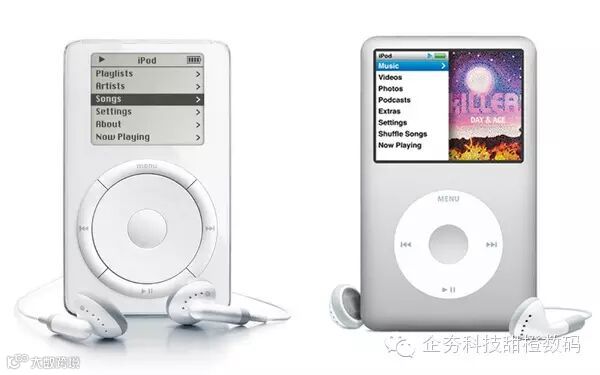 苹果公司最早发布的iPod(左侧),以及2011年的经典款(右侧)。