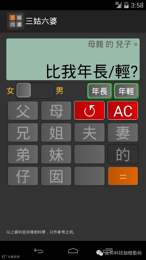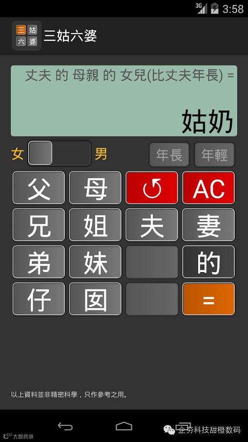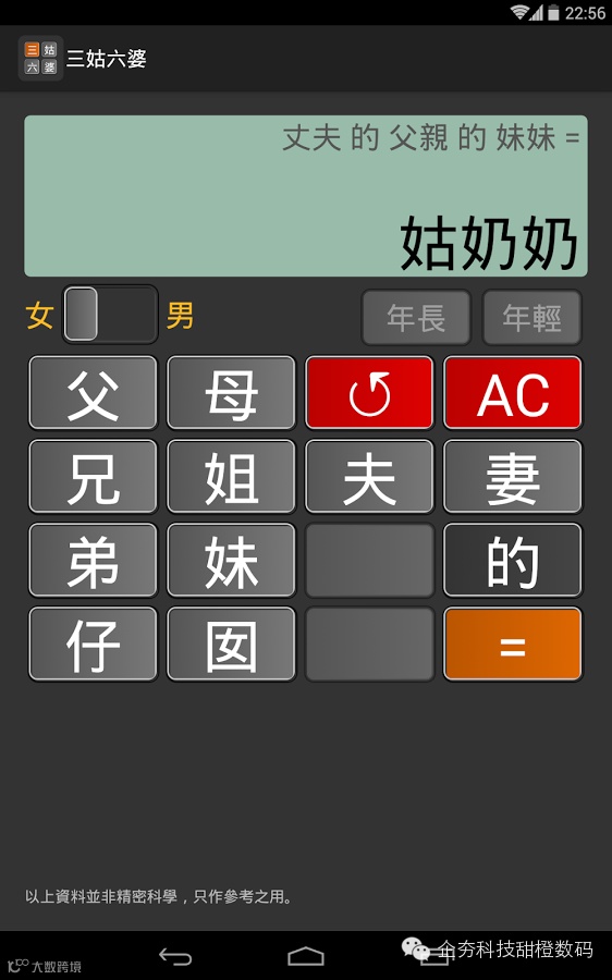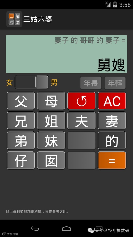 看到亲戚不知道该叫啥好什么的最讨厌了。于是临近过年之时,微博上出现了一张帮你理清亲戚关系的树状图。但是对于读图能力比较有限的童鞋来说,计算器这种输入-输出的直观模式更靠谱点。没错,我们今天要介绍的就是可以帮你算清三姑六婆的计算器App。这款计算器用“父”“母”“兄”“妻”等称谓代替了普通计算器上的数字按键,不知道如何称呼亲戚时,只要输入比较亲密的血缘关系,再层层叠加就好了。