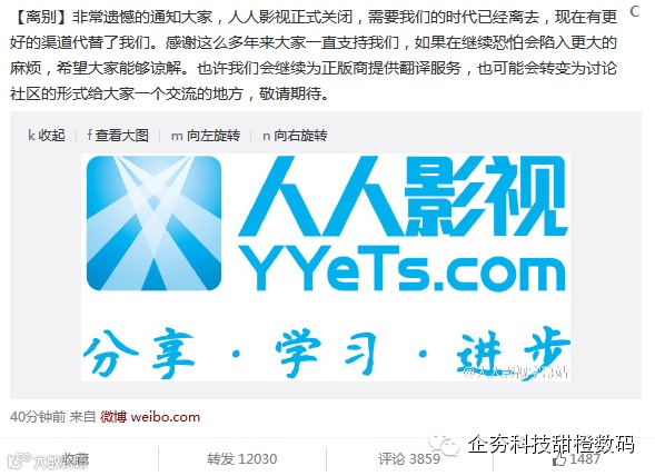 12月20日上午10点44分,在历经几度关停风波之后,人人影视通过官方微博发出正式关闭声明。“非常遗憾的通知大家,人人影视正 式关闭,需要我们的时代已经离去,现在有更好的渠道代替了我们。感谢这么多年来大家一直支持我们,如果再继续恐怕会陷入更大的麻烦,希望大家能够谅解。也 许我们会继续为正版商提供翻译服务,也可能会转变为讨论社区的形式给大家一个交流的地方,敬请期待。”