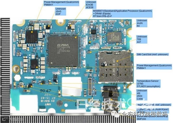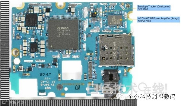 米4的芯片组采用以美国高通的四核处理器“MSM8974”为首的高端产品。配备了美国安华高科技的功率放大器、高通的功率放大器专用电源管理IC“Envelope Tracker”等。摄像头像素也高达1300万(不过未配备光学手抖动补偿功能)。DRAM封装上可以清楚看到被美国美光公司收购的尔必达存储器的字样。而且容量为3GB。基板采用的也是全球最大规模的厂商之一——台湾欣兴电子的产品。保存照片和音乐的闪存由三星电子制造。