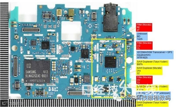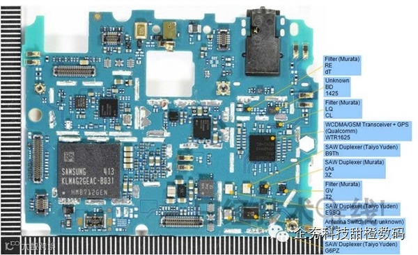 主板PCB#1电池侧3,米4把滤波器和双工器直接安装在主板上,估计是为削减成本