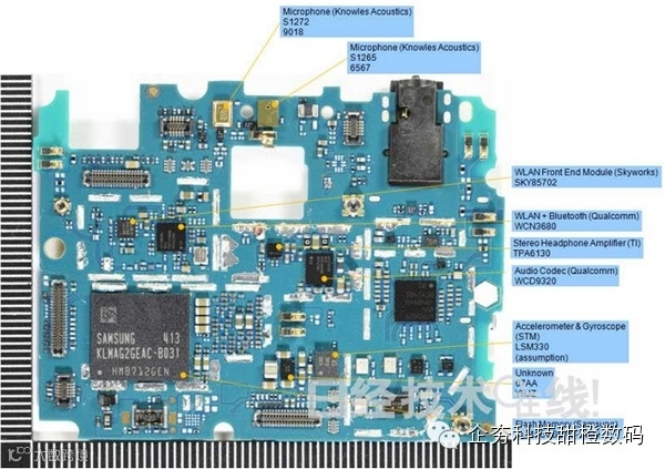 中国制造的智能手机一般通信模块在基板上所占的面积非常小,在这个狭窄的面积中密密麻麻地安装着中国本地厂商生产的“国产电子部件”。但米4却不是这样。米4与全球广泛销售的高端智能手机一样,采用世界知名厂商的电子器件,其内部构造极为普通。