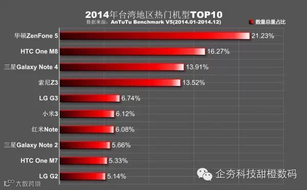 HTC和华硕是台湾本土最火的两个品牌,其品牌机型也占据了排行榜的头两名,华硕的ZenFone 5在价格上相比HTC M8要有优势。小米进入台湾时间较晚,但表现不俗,占据排行榜中两个位置,整体上看台湾地区的消费者对韩系、日系品牌十分钟爱,但无法超越本土品牌的地位。