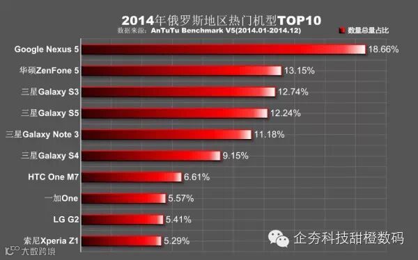 俄罗斯地区排名最为稳固的机型是Google Nexus 5,这款机型长期占据排行榜第一位,俄罗斯的消费者对Google Nexus 5的喜爱从未减退,三星有四款机型上榜,意外的是华硕的ZenFone 5和HTC M7在俄罗斯卖的也不错,当然最让人高兴的就是一加又一次进入排行榜中。