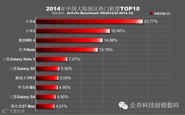2014年的国内市场品牌占有率最高的是小米,这也体现在机型的数量上,一共有3款机型上榜。魅族的MX 4虽然发布较晚,但后劲很足,占有率一举挺近前三。前十名的机型中三星一共有三款机型进入榜单之中,保持了惯有的优势,但排名有所下降。总的来说,大陆地区的智能手机大多数被国产品牌占据重要位置,国际品牌中只有三星上榜。