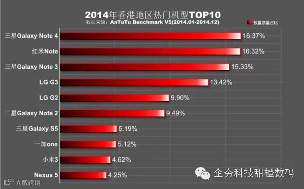 香港地区红米Note和三星Galaxy Note 4的占有率不相上下,差距很小,小米有2款机型入选。三星则是在香港地区的品牌占有率提升,一共有四款产品上榜,香港地区的消费者对三星还是情有独钟,香港地区热门机型中全年在榜时间最长的机型是Google Nexus 5,虽然排名并不高,但在各个季度的表现都很均衡。韩系品牌在香港地区的表现都不俗,LG的前后两代产品依次上榜,总的来说香港地区的消费者对大屏幕手机需求较高。