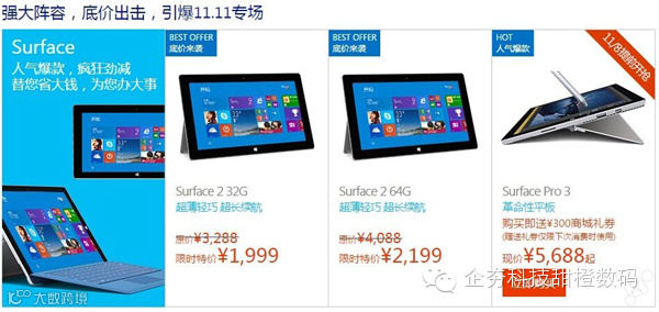 微软的Surface平板(Surface 2、Surface Pro3),Lumia手机(Lumia 930、Lumia 1520、Lumia 830)以及Xbox One和Office等硬件软件都参与了双十一活动,其中降价幅度最大的是Surface平板,Surface 2 32G从原来的3288元降到1999元,64GB版从4088元降至2199元,几乎腰斩。