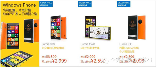 手机方面,Lumia 930由3599元降到2999元,Lunia 1520从2999元降价至2599元,Lumia 830从原来的3399元降到3099元,降了300元。Office从399元降价到149元。