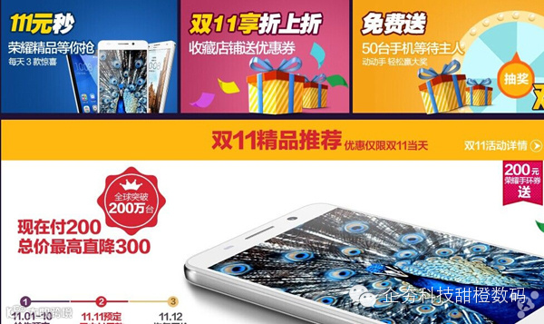 华为力推荣耀系列,华为在双十一优惠页面上表示,华为荣耀6最高降价300元。华为荣耀6移动和联通标准版原价1999,双十一价格1799元,高配本原价2299,双十一价格1999,至尊版原价2999,双十一价格2699元,华为Ascend P7降价200元至2388元。