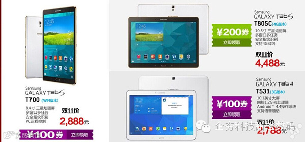 平板电脑方面,三星今年推出的三款平板电脑则提供了现金券,最高200元。