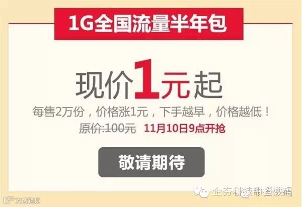 “双11”热闹的不仅是电商,现在联通也推出了“1元1个G,1元1个机”的特惠活动,1GB全国流量半年包仅售1元起。根据官方消息,特惠活动从11月10日起,截止到11月17日,从10日9点开始,原价100元的1GB全国流量半年包起售价1元,每售2万份,价格涨1元。也就是说有近200万份流量包是低于原价的,联通小伙伴们不妨参与一下。