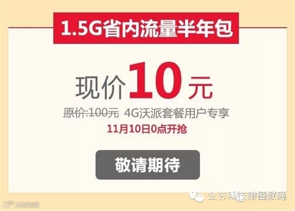 此外,联通还提供了1.5GB省内流量半年包,10日0点开抢,售价10元(原价也是100元),仅限于4G套餐用户。