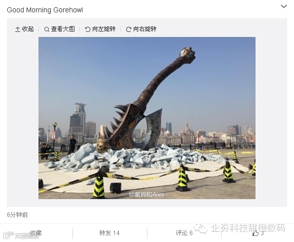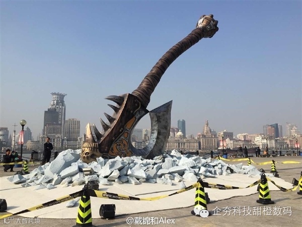 王自健在周末的《魔兽世界:德拉诺之王》中国上线庆典上宣布格罗霍姆·地狱咆哮的“血吼”大斧将于11月20日国服上线时砸入上海。现在,前暴雪大中华区总裁戴锦和微博曝光了这一实景广告的工地照片。