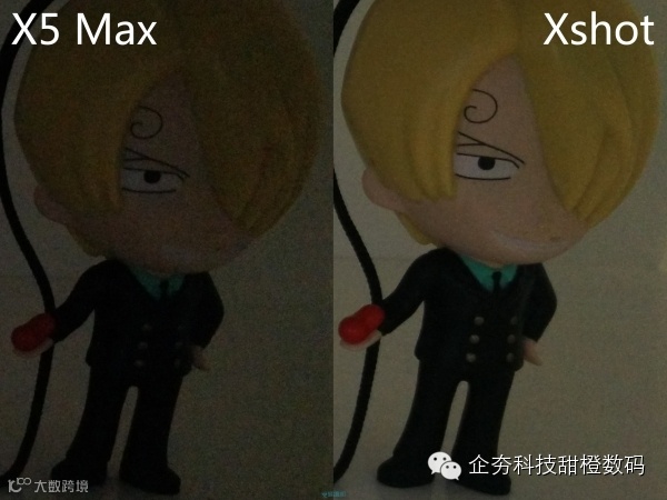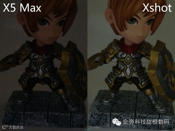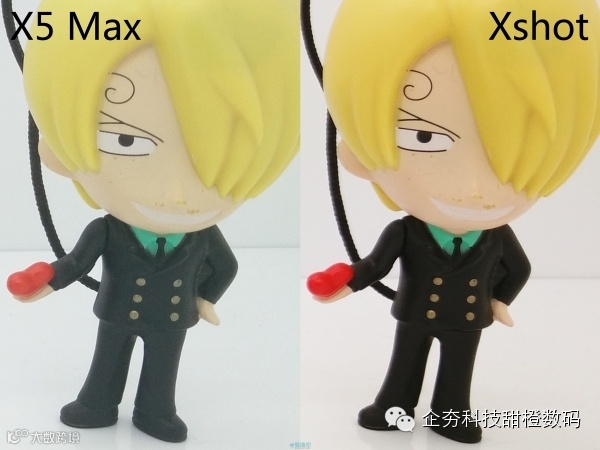在第一组光线明亮的样张之中,X5 Max和Xshot均表现优异,但是二者很明显在发色倾向上存在明显区别:X5 Max的样张颜色清淡,整体对于色彩的还原比较准确,而Xshot发色明显是属于艳丽型的,玩偶的“脸色”相比较X5 Max拍摄的样张之中更加地红润,整体色彩饱和度也高了许多。