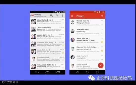 同时值得说明的是,Google希望Material Design给用户带来纸张化的体验。新的UI设计,在基本元素的处理上,借鉴了传统的印刷设计,从字体版式、网格系统,到空间、比例、配色、图像等方面,都惊醒了大胆的平面化的创新。