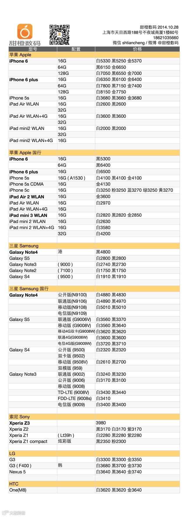 iPhone 6 的 64G 十分抢手,白色再次断货;iPhone 6 plus 则是有较大幅度的降价,达到 150 元之多,黑色款性价比凸显;三星 Galaxy Note 4 和 S5 皆有小幅降价;iPad Air 和 iPad mini 2 再创新低,Air 2 和 mini 3 暂无大批量上市。