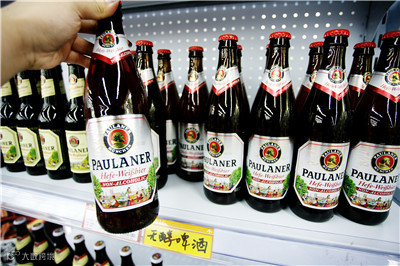 在众多啤酒中,工作人员向记者推荐了一款德国柏龙慕尼黑酵母型小麦啤酒,“瓶内十分浑浊,完全不像其他啤酒那样。这款啤酒的讲究之处在于,一般啤酒是发酵好以后装箱,而这种啤酒是直接装瓶,酒的发酵是在瓶子里完成的,这种啤酒在德国也卖得非常好。”