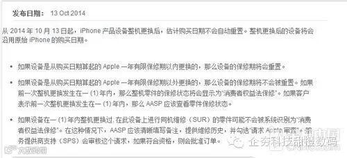 那是不是就意味着国行iPhone从此之后就没有换新重置保修一年的特权了呢?其实不然,下面还有关于这一政策的详细条款。