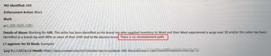 三是在内部备注中往往会出现“There is no reinstatement path”,即无申诉恢复路径的批注。