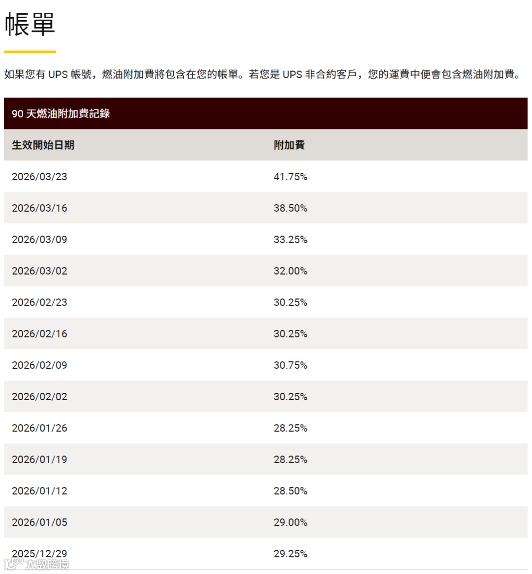 据UPS官网公布的2026年燃油附加费表,国际空运出口服务费率持续走高: